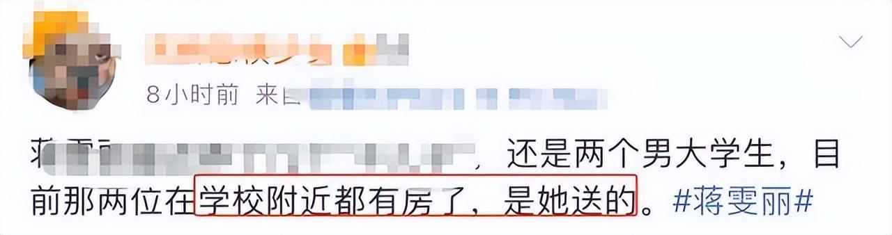 更让人大跌眼镜的是,蒋雯丽包养的这些“干儿子”中,有两位还是在校男大学生。爆料称,蒋雯丽十分宠爱这对“干儿子”,对他们也是有求必应。为了这两位大学生方便,蒋雯丽斥巨资给两位“干儿子”在学校附近购置了豪宅。