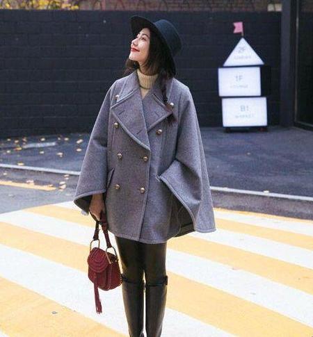斗篷式大衣搭配过膝长靴是秋冬最时髦的穿法,会让人的身材和腿显得修长。不看镜头地闭眼微笑,是不是非常有范儿。