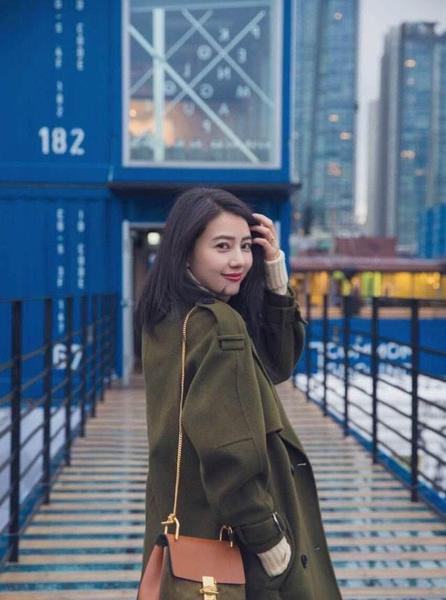 同样又是一个回眸,军绿色的大衣搭配同样有军绿色元素的挎包,这个颜色传出来本身就很提气场。那回眸的一瞬间,不经意撩起的秀发,更显得有魅力。各位宝宝们也可以学习起来哦。