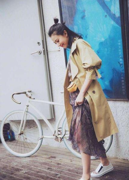 普通的风衣外套即使搭配白色板鞋也可以有特点,在于风衣的灯笼袖口,还有裙子花色和鞋子花色元素的搭配。半丸子头和拉裙子的动作显得俏皮可爱。这样的街拍达人,满分。
