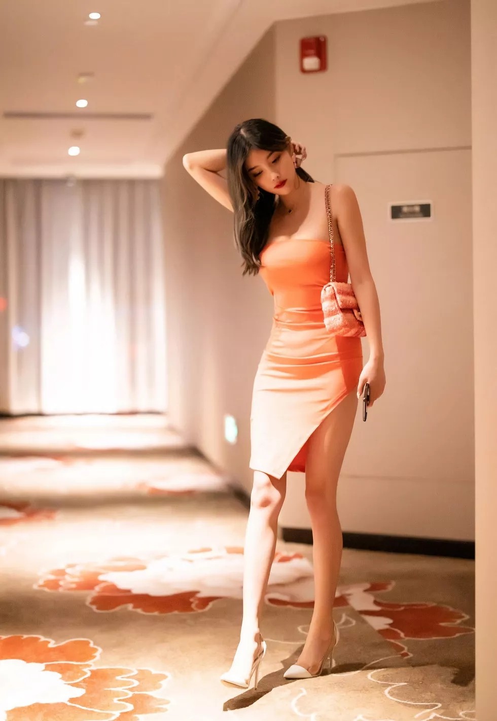 女神杨晨晨sugar橘色连身裙配黑色高跟鞋时尚穿搭