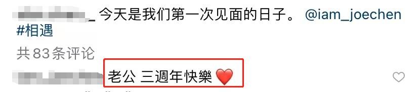 发文时,艾伦还配文道“今天是我们第一次见面的日子”,陈乔恩也在动态下面回复“老公,三周年快乐”。