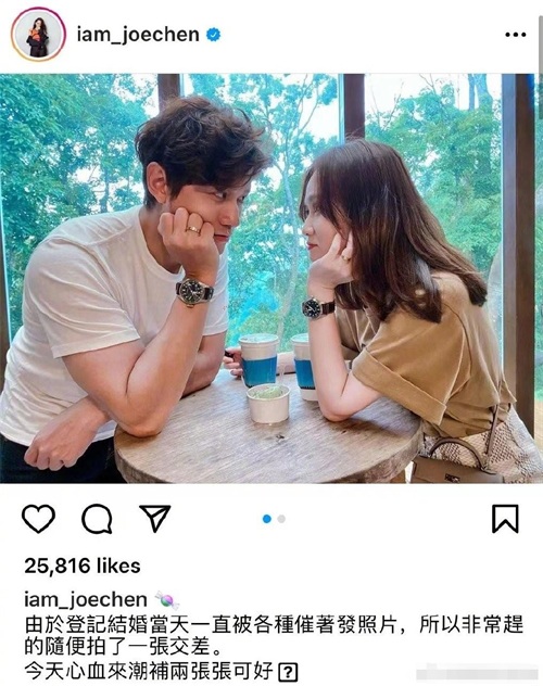 虽然消息传得满天飞,但两人却并没有正面回应,随后5月12日晚,陈乔恩晒出了手戴婚戒的照片,高调地承认了与男友登记结婚这件事。