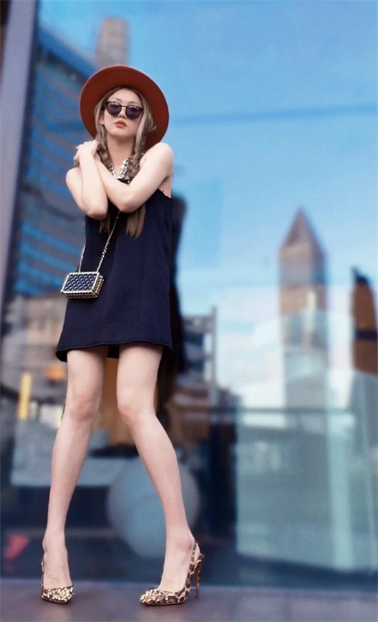 等李彩桦把西装脱掉,里面只有一条黑色吊带超短裙时,一双豹纹高跟鞋拉得腿又细又长,搭配复古的帽子与麻花辫,时尚又性感。