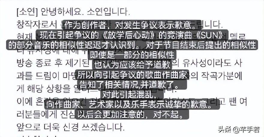 于是田小娟马上发文进行道歉,她表示:“作为创作者,对发生争议表示歉意,现在引起争议的《放学后心动》的竞演曲《RUN》的部分音乐的相似性迟迟才意识到,对于节目结束之后提出的相似性,即便是一部分的相似性,也认为应该给予道歉,对此次引起的混乱想作曲家道歉, 以后会更加注意,对不起。”