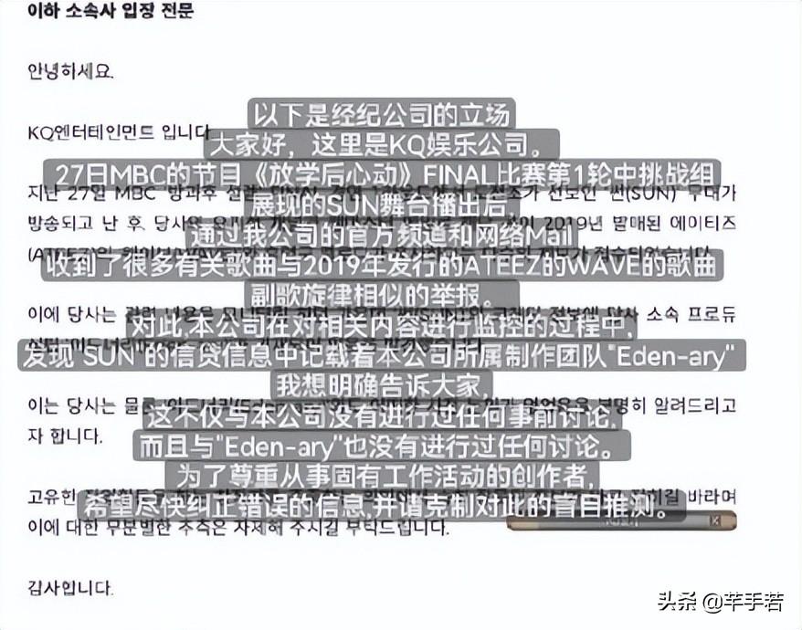 很快ATTEZ的所属娱乐公司KQ也是发声明为Eden-ary证明,直言公司并未收到了来自CUBE的合作邀请,这可以说让田小娟非常尴尬,因为这是实锤田小娟抄袭。
