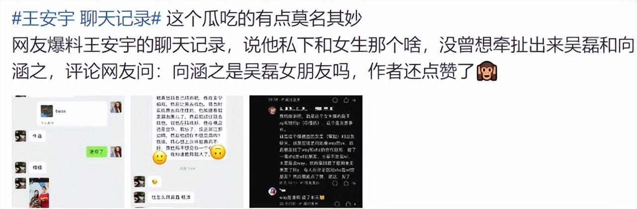 先说下王安宇的瓜,有网友晒出和朋友的聊天记录,爆料王安宇私下约她,但没想到牵扯出吴磊和向涵之,聊天内容的信息量很大。