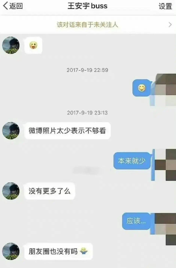 另外,该网友还详细说了王安宇约她的细节,那时王安宇还没火,在这位网友心中她觉得王安宇特别自恋,当时王安宇正在金华拍戏,然后让这位网友去找他,王安宇还问这位网友想不想他,但这位网友和王安宇之前见面的感觉并不好,觉得王安宇还很小,言语中似乎并不想见面,但她没想到王安宇最后火了,她还说王安宇的资源特别好。