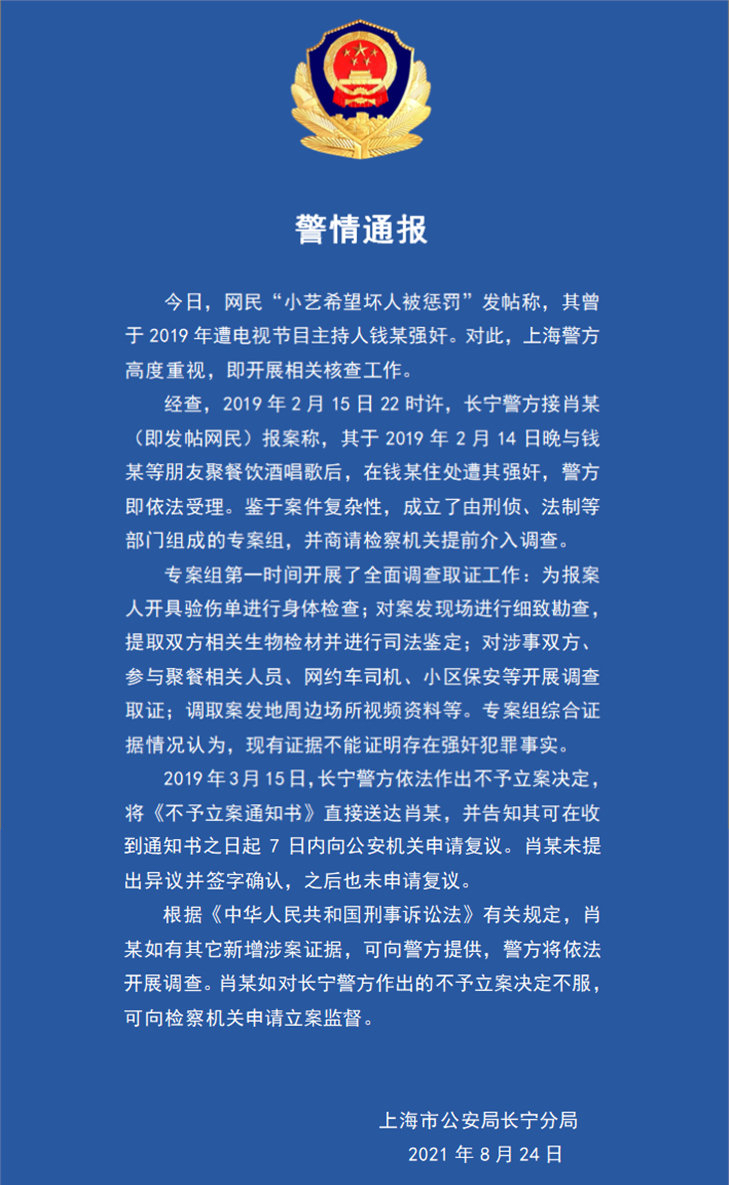 结果又被一份蓝底白字的通报:现有证据不能证明钱枫存在强奸犯罪事实。