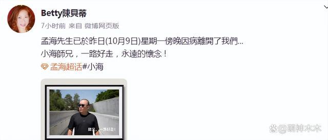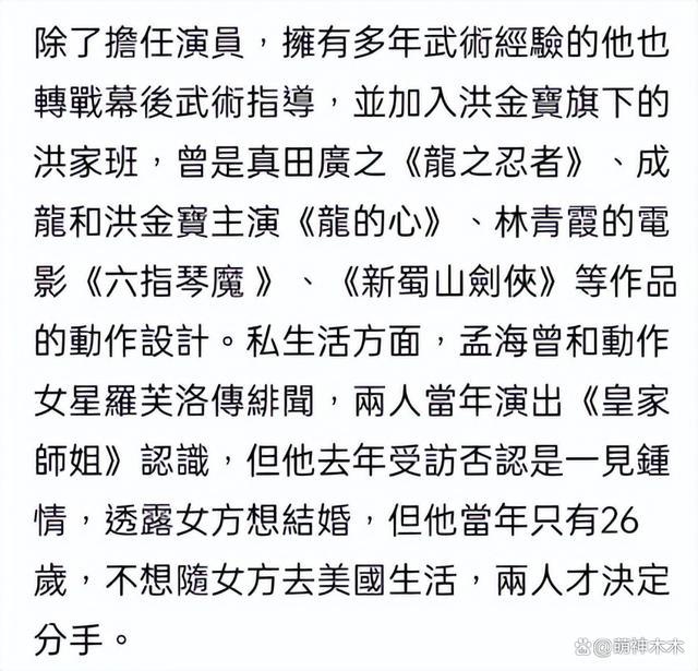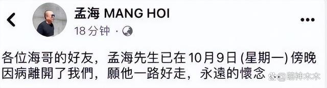 又一位 " 洪家班 " 成员去世!他就是香港资深武术指导、著名动作演员孟海,与李小龙、周星驰等有过深度合作,亲友通过孟海个人社交平台发布讣告,称他因病在 9 日傍晚病逝离开了大家,终年 65 岁。随后,多位明星好友在社交媒体平台发文悼念。