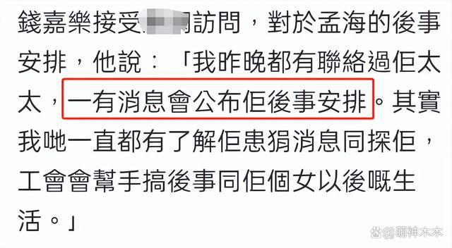 钱嘉乐谈到孟海后事的安排,也说有跟孟海太太联系过,等有确定细节后会公布,并讲工会帮忙处理后事和他女儿以后的生活。