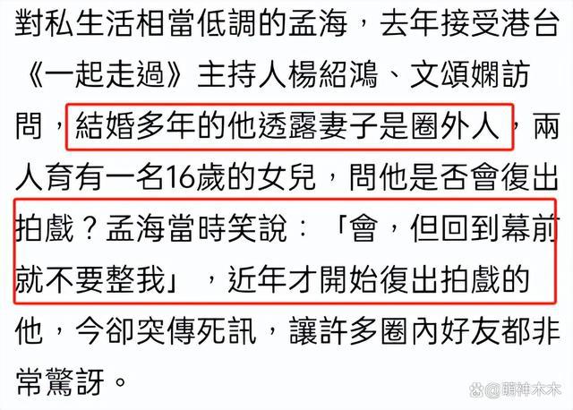 在去年的访谈中,孟海还被问到会不会复出拍戏,当时他表示会,还讲希望回到幕前大家不要整他,实在太唏嘘。