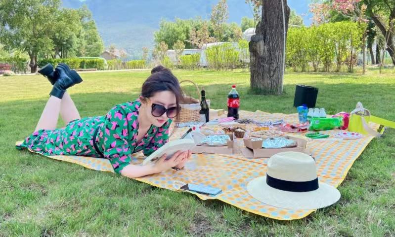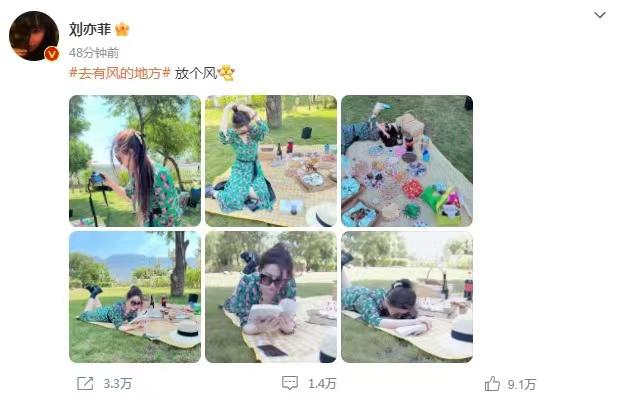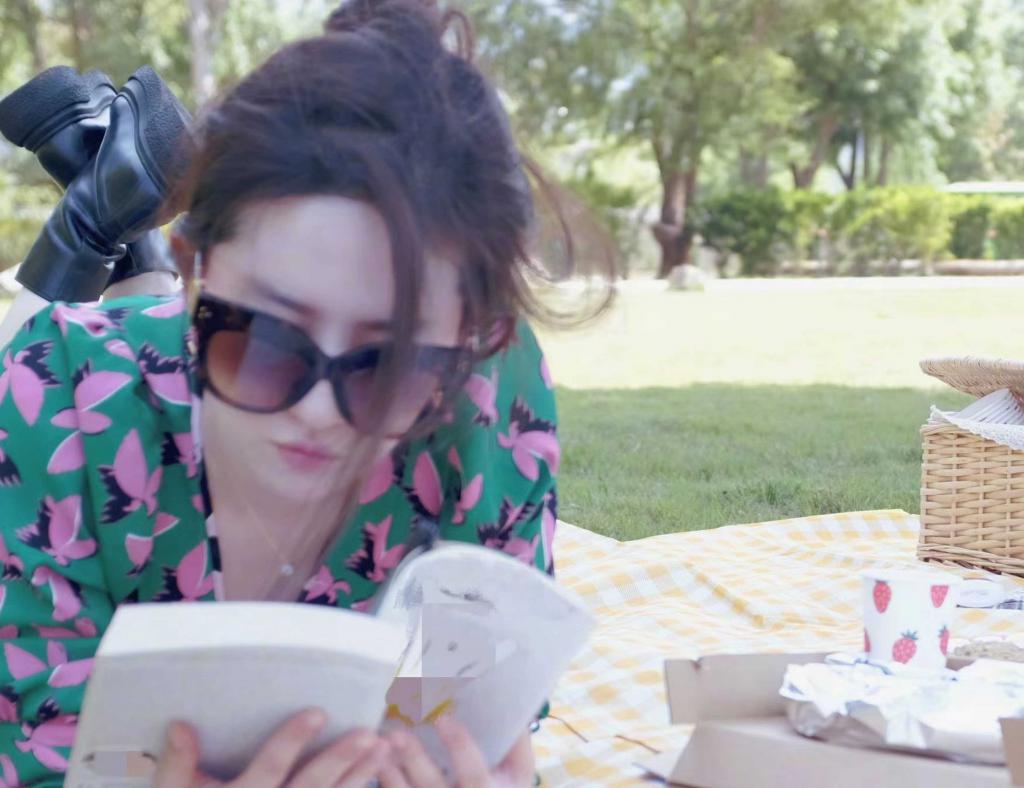 1 月 11 日,刘亦菲在社交平台上晒出自己户外野餐的照片,并配文:" 放个风。" 照片中,刘亦菲身穿绿色清新长裙,戴着墨镜,趴在草地上看书,在树林草地里享受阳光和美食,十分惬意优美。
