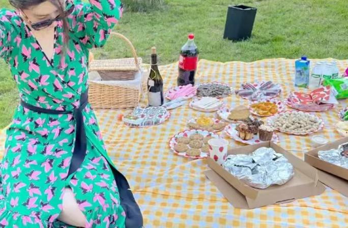 刘亦菲晒野餐照,穿绿裙腰身纤细白到发光,餐垫上的饮料好接地气
