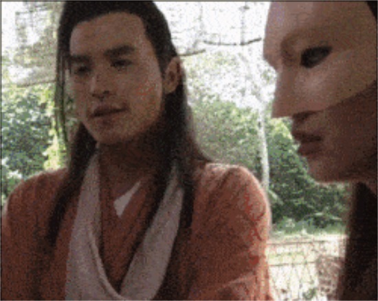三人围坐在小桌前,陆无双同时扯下程英和杨过的面具,镜头再分别来个特写。程英一脸娇羞错愕,杨过则惊艳的目瞪口呆。