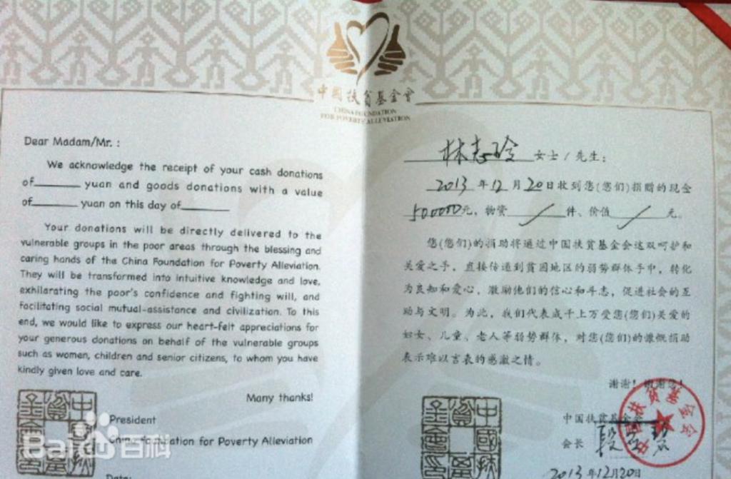 从2013年起,她不断向中国扶贫基金会捐款。