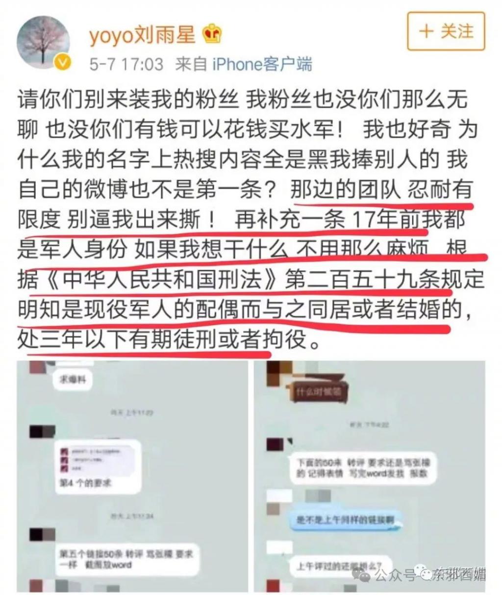 面对水军围攻,刘雨欣又发出一条微博,点明插足自己婚姻的小三是破坏军婚,她如果真要计较,根据刑法规定对方是要坐牢的。