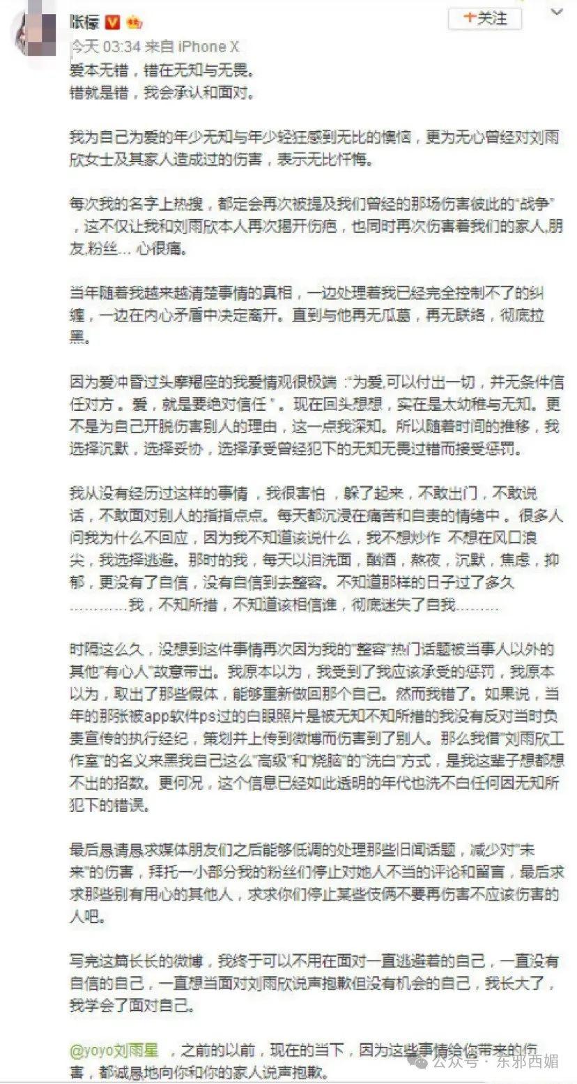 充满喜感的一幕出现了!张檬秒怂滑跪,凌晨三点半发出长微博向刘雨欣道歉。展现出前所未有的低姿态,表示 " 无比懊恼 "," 无比忏悔 ",称自己犯错是因为 " 爱的年少无知与年少轻狂 "。
