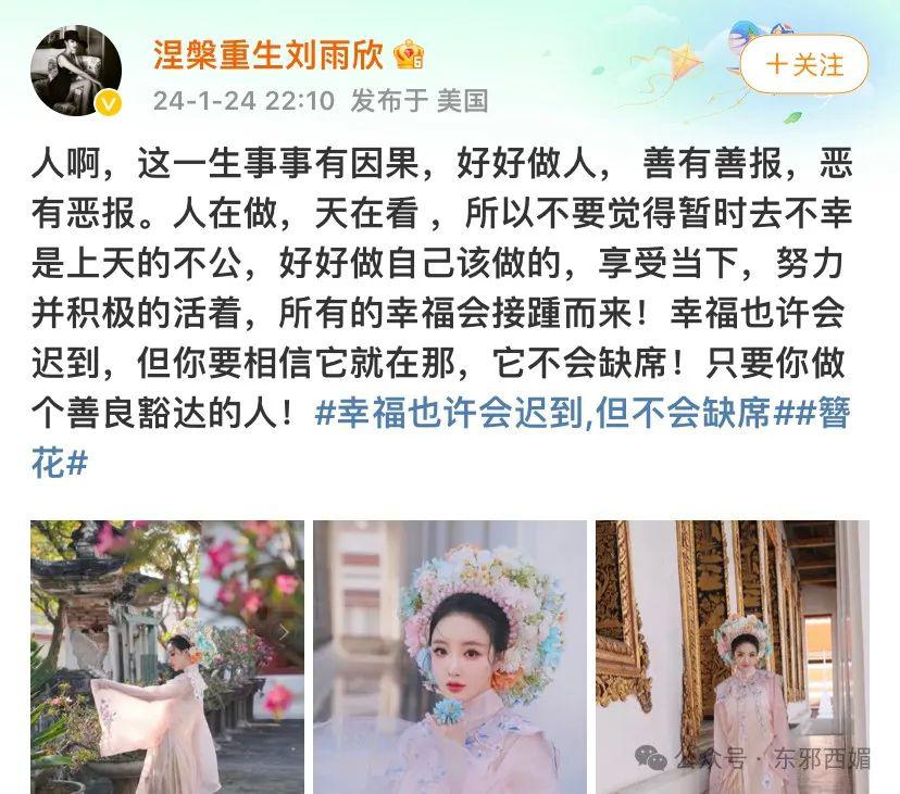 就在这时候,刘雨欣发博:善有善报,恶有恶报。人在做,天在看。