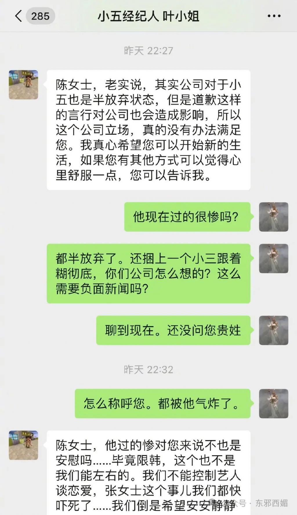 姑娘还晒出了跟小五经纪人的微博对话,对方说公司对小五已经是半放弃状态,结果还出了 " 张女士这个事我们都快吓死了 ",哈哈哈哈。