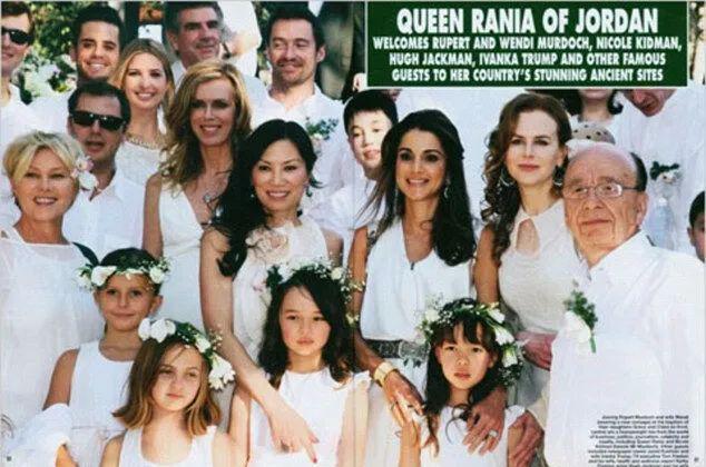 2010 年和默多克跑到约旦去给俩孩子办洗礼,连约旦王后拉妮娅都出席了。照片里的全是明星大腕。