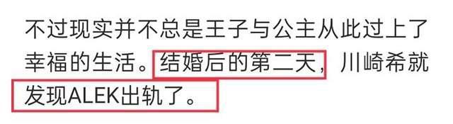 万万没想到的是,就在结婚后的第二天,亚历山大便按耐不住下半身劈腿他人,给川崎希戴了顶绿油油的帽子。
