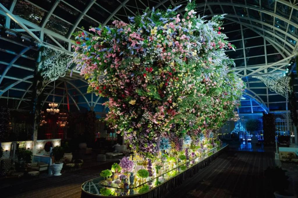 为了这次派对,他们还原地建了一座玻璃房,面积足以轻松装下1500名客人。据说这座玻璃房是仿照了纽约布鲁克林植物园棕榈屋建的,这是新娘留学美国时最喜欢的地方之一。真霸总文情节照进现实……