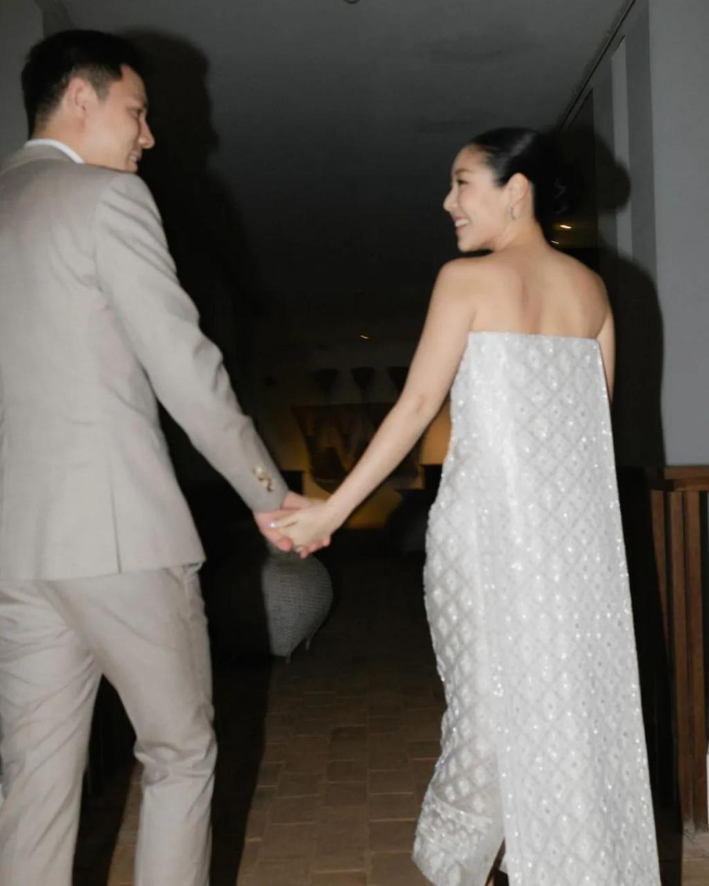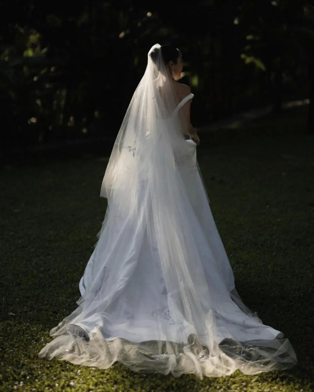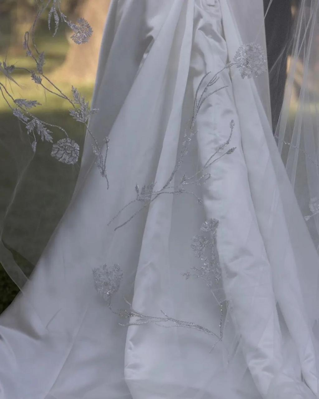 礼服是泰国本地小众品牌Mesh Museum定制的,细节非常重工,薄薄的头纱上错落绣上的银丝亮片组成的花朵,朦朦胧胧,远远看就像一幅古典油画。