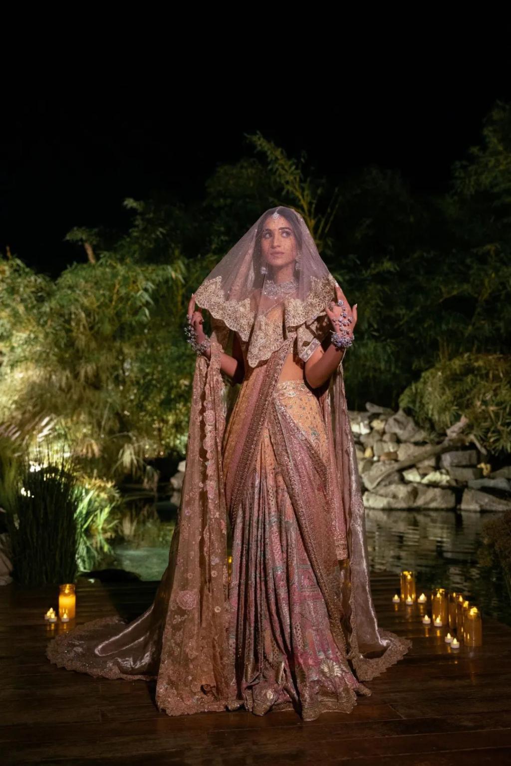 还有最后这套纱丽,披肩上的图案是手工绘制的,头纱是用24K金线编织而成的,随着走动,灯光下那叫一个流光溢彩。
