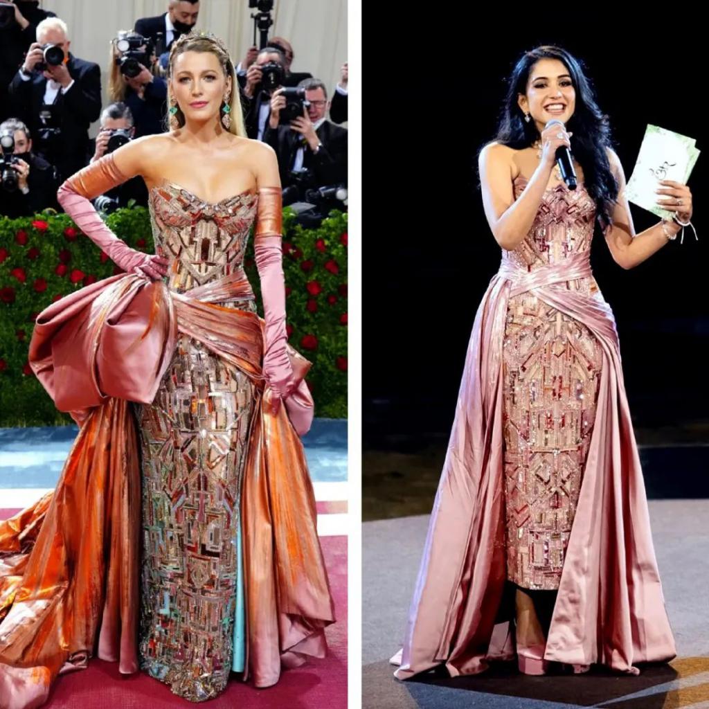 打头阵的第一套晚宴服,来自Atelier Versace定制,直接撞款红毯女王Blake Lively 2025年Met Gala的战服。