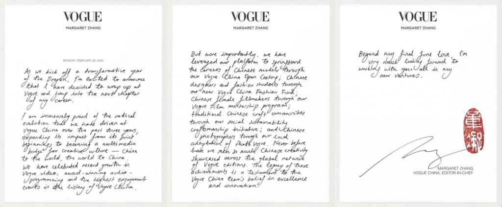 章凝本人在离职消息传出之后,也用中英双语洋洋洒洒的手写离职信证实了这个消息。