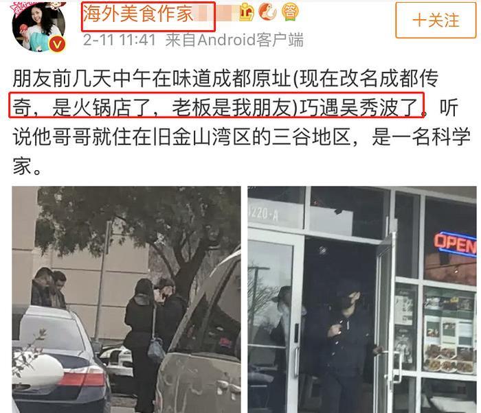 吴秀波这段期间一直都非常低调,鲜少在公众场合现身,吃瓜网友也都非常关心他的动向。2月11日,一位定居国外的网友发文称,朋友前几天在一家餐馆巧遇吴秀波,并还po出了偶遇照片,吸引了不少网友的关注。