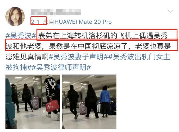 早在2月初,就曾有网友发文称在去往洛杉矶的飞机上偶遇到了吴秀波夫妇,当时吴秀波也将自己遮挡的非常严实,他身边同样出现了那位背蓝色包包的长发美女,想必网友所说的吴秀波妻子应该指的就是她了。