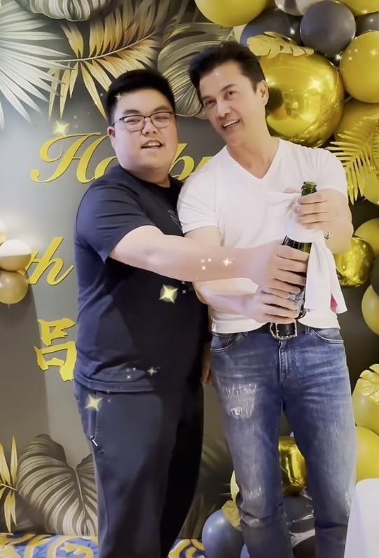 之前吕良伟晒了一张与儿子的合照。他穿着白色T恤,搭配时尚牛仔裤,显得精干而年轻。19岁的吕善扬一身黑色老头衫,大腹便便,富态十足。