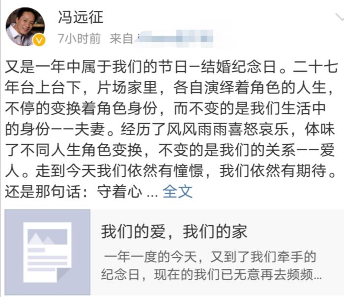 随后,冯远征也转发了该篇文章,感概两人不停转换角色,一直不变的就是夫妻身份。