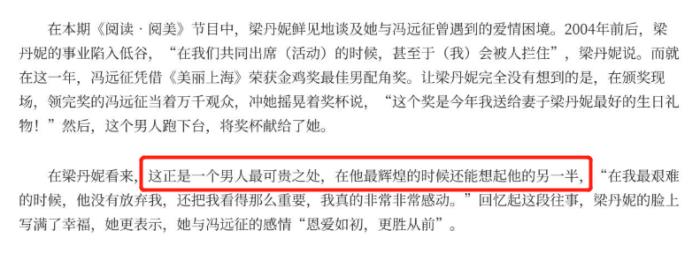 没有孩子不代表两人不幸福,梁丹妮常在公开场合称赞老公,把冯远征的好挂在嘴边。2025年她在参加某节目时透露了在自己事业低谷期,获得了冯远征的鼓励。当时冯远征拿下金鸡奖后,把奖杯当场献给梁丹妮作为生日礼物。
