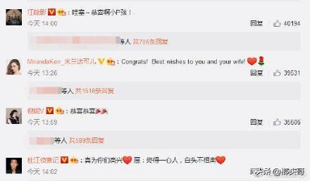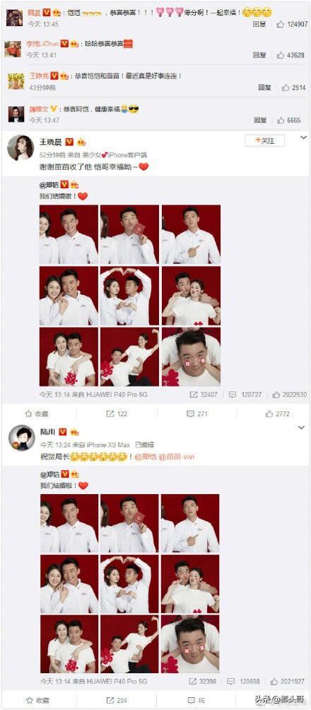 #郑恺苗苗结婚#官宣后,跑男家族angelababy、李晨、王祖蓝、包贝尔、朱亚文、宋雨琦道喜,祖蓝还调侃郑恺图修得不错,赵薇、倪妮、钟楚曦、杨采钰、江疏影、米兰达可儿、杨丞琳、魏晨、陆川等也送上祝福。新浪娱乐致电双方工作人员询问婚礼相关,对方并未透露细节,“不好意思,我们正在开会”。对于是否奉子成婚,双方均缄口不谈。