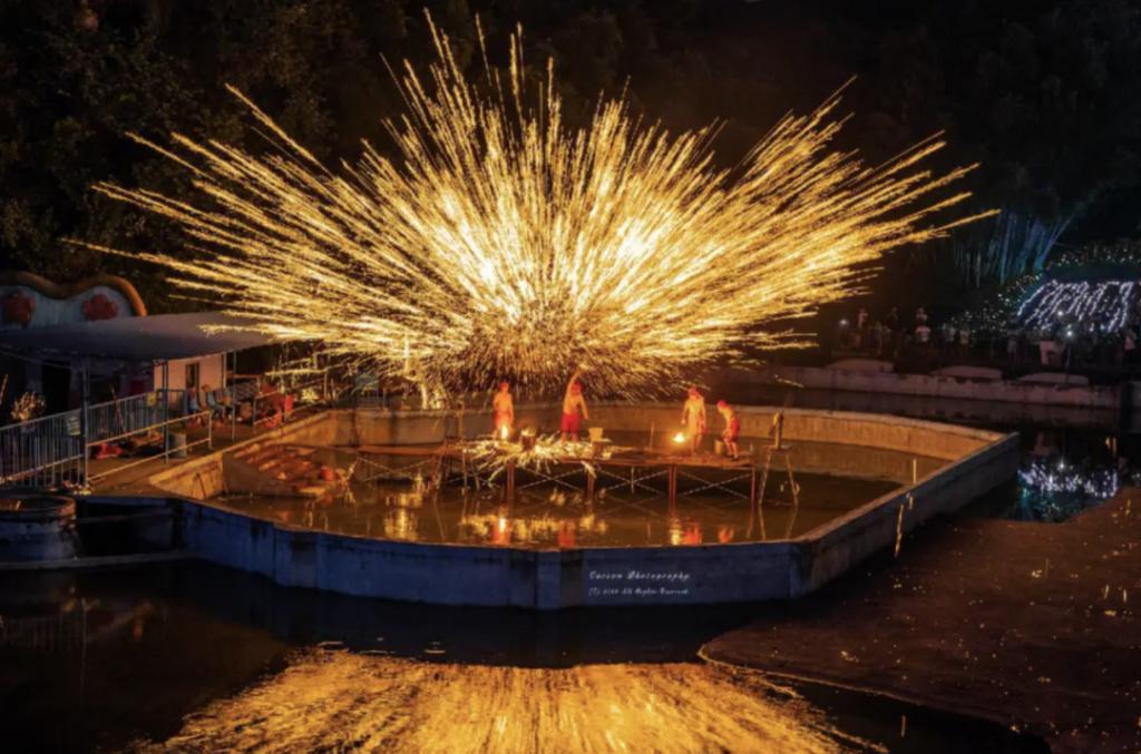 打铁花,始于北宋确山县,最初用于祭祀道教的神祇。传说某年确山县大旱,农民着慌,就通过熔化铁器、击打柳木来制造火花,以此震动上天,祈求甘霖。