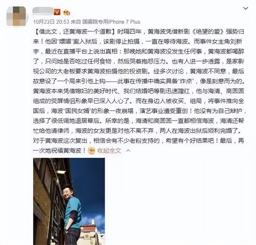 随后其所属经纪公司在17日也公开向公众致歉,为黄海波的非法行为给大家造成不良影响道歉。