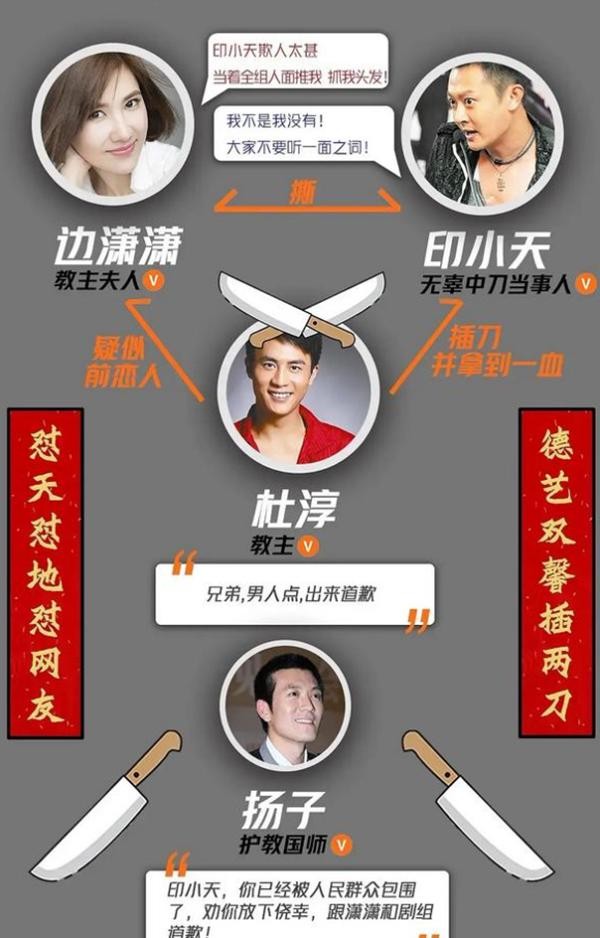 那时,杜淳站出来让印小天出来道歉,接着杨子也站出来让印小天给剧组和女演员道歉。力挺边潇潇的明星以李晨为代表,他表示相信女方。贾乃亮、保剑锋、黄觉、李小璐等人均侧面证实此事,印小天顿时沦为众矢之的,解释都无用。
