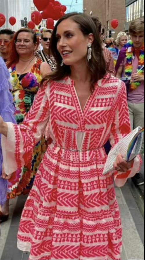 服饰风格的选择需要满足基本的场合需求,在这场街头活动中,桑娜也有意迎合活动主题,所以没有选择拘谨的职场打扮,反而有意增强街头元素和时尚风味,所以对于色彩的运用非常大胆,红色印花结合宽松的版型营造的度假氛围非常浓郁,亮眼且有着很好地的放松效果,有效拉进了与民众的距离感,在形象塑造上展现得非常高情商。芭比粉高跟鞋的搭配,着重释放女人味,打破了传统职场着装的中性风格调,大胆的色彩搭配也算是为保守的着装增添了突破性的审美效果。