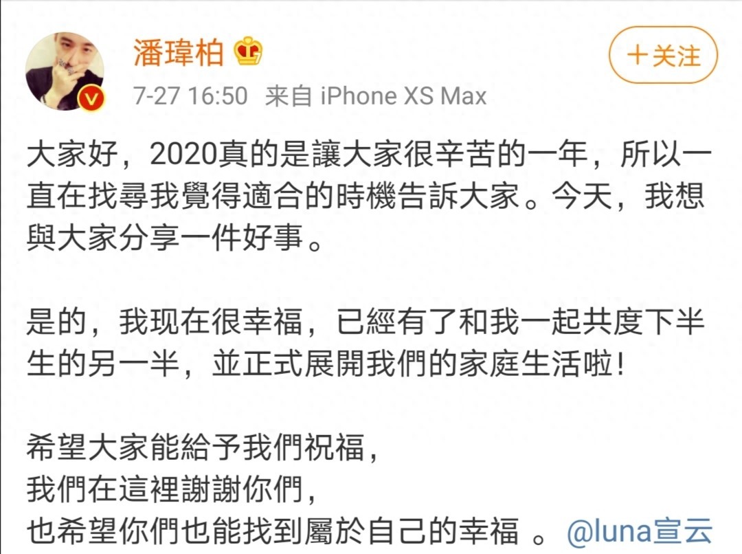 2020年7月27日,潘玮柏官宣与Luna宣云结婚。