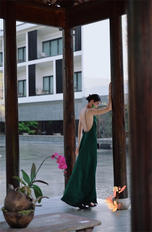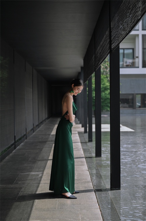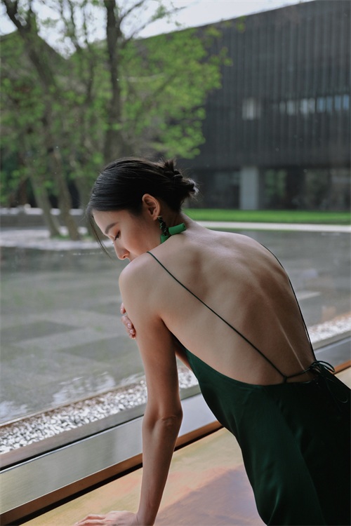 我们看到王诗晴的这组写真中,她身穿绿色低胸吊带大露背长裙,在室外的庭院做背景拍摄写真。