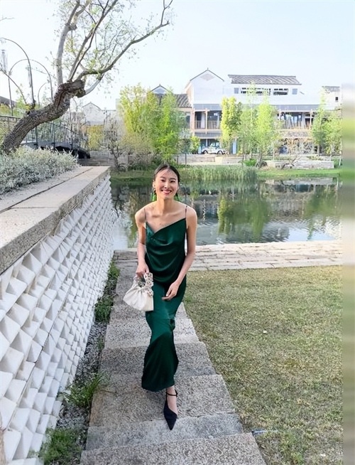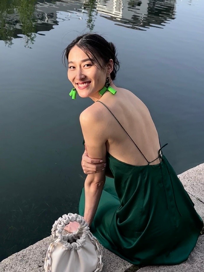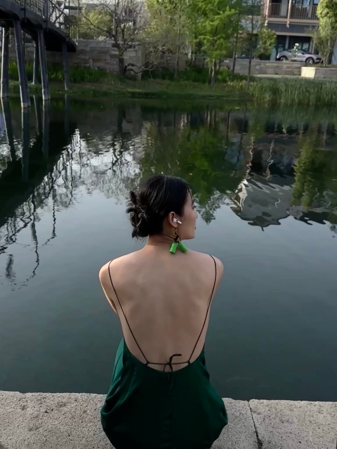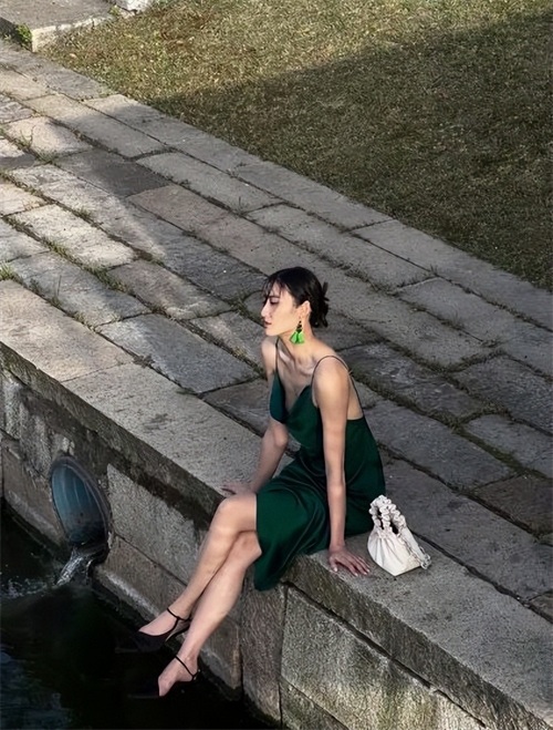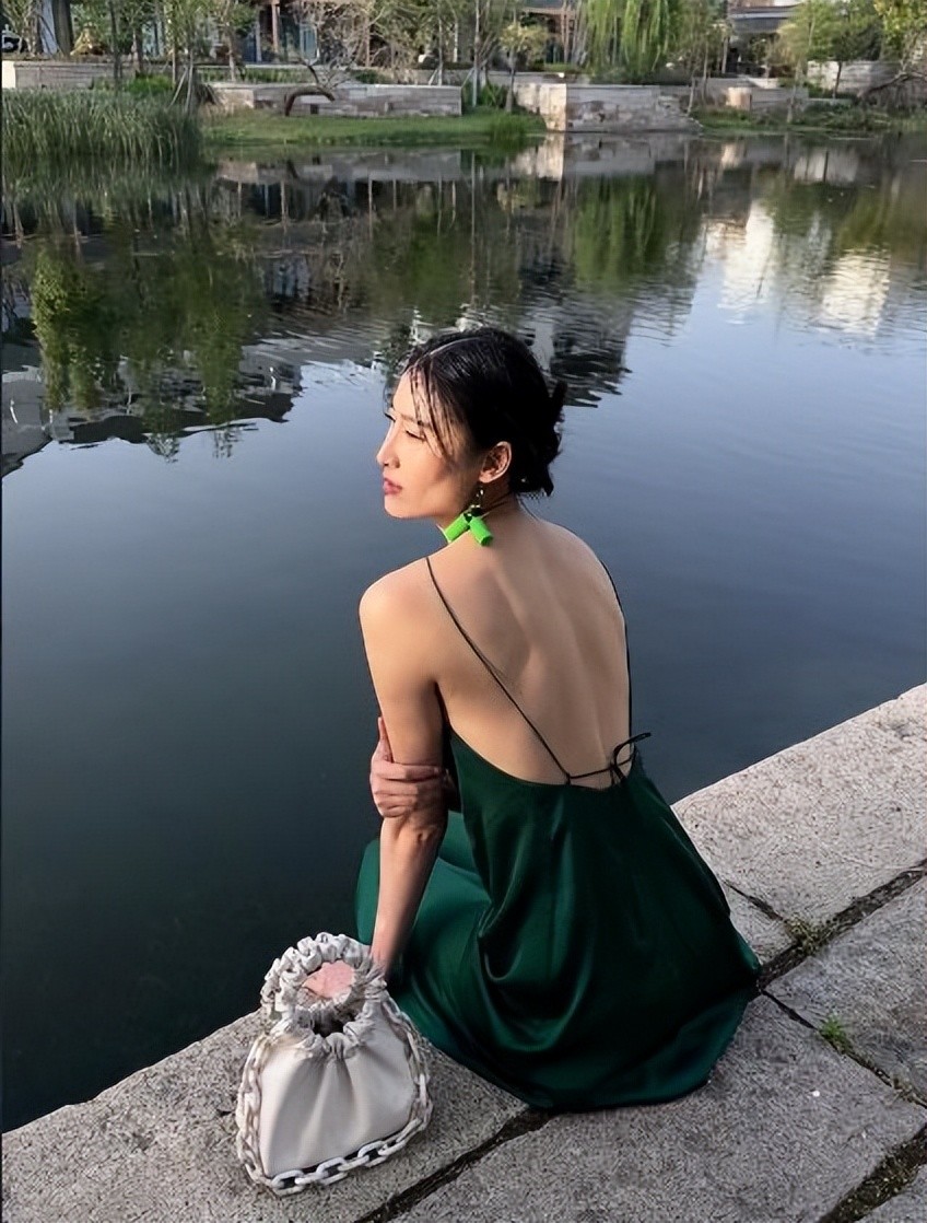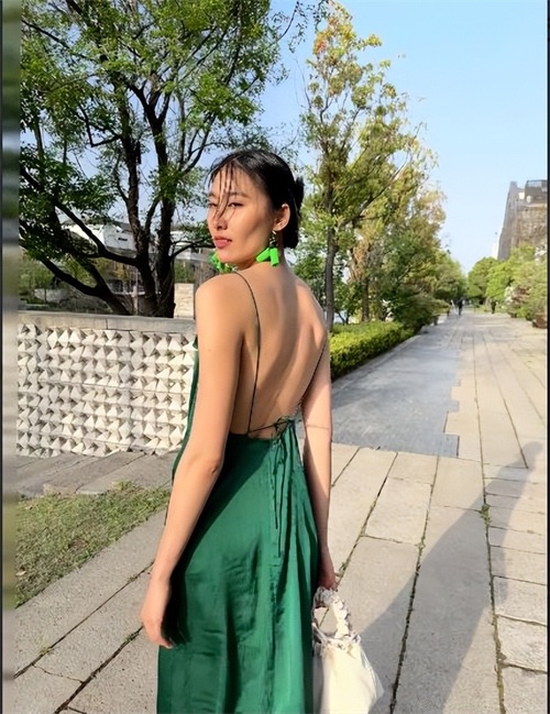 国际名模王诗晴晒出绿色裙子写真,低胸大露背充满初夏气息