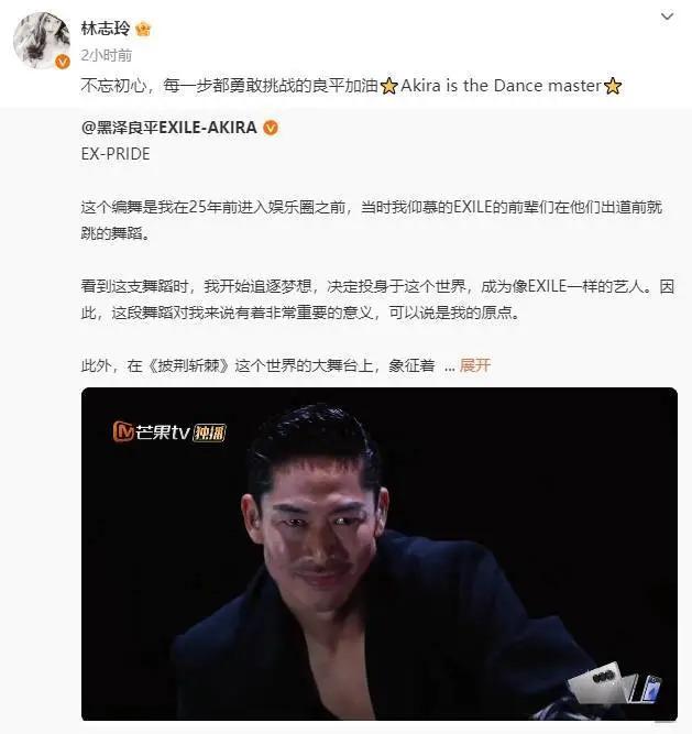 8 月 9 日,林志玲转发老公黑泽良平在《披荆斩棘》的初舞台为他打 call,爱意十足!林志玲说:" 不忘初心,每一步都勇敢挑战的良平加油!Akira is the Dance master!" 不少网友看到后还纷纷留言推荐林志玲去参加《浪姐》。