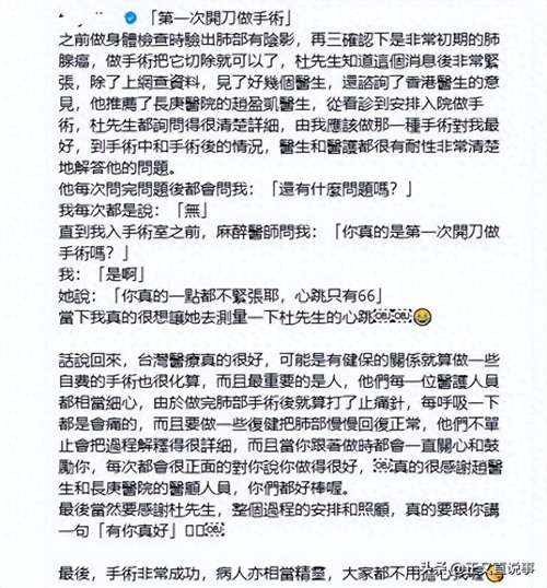 在知道这位医生靠谱之后,杜汶泽便开始亲力亲为,从安排入院到做手术,处处都细致入微,连手术中都一直在向医生打听情况。