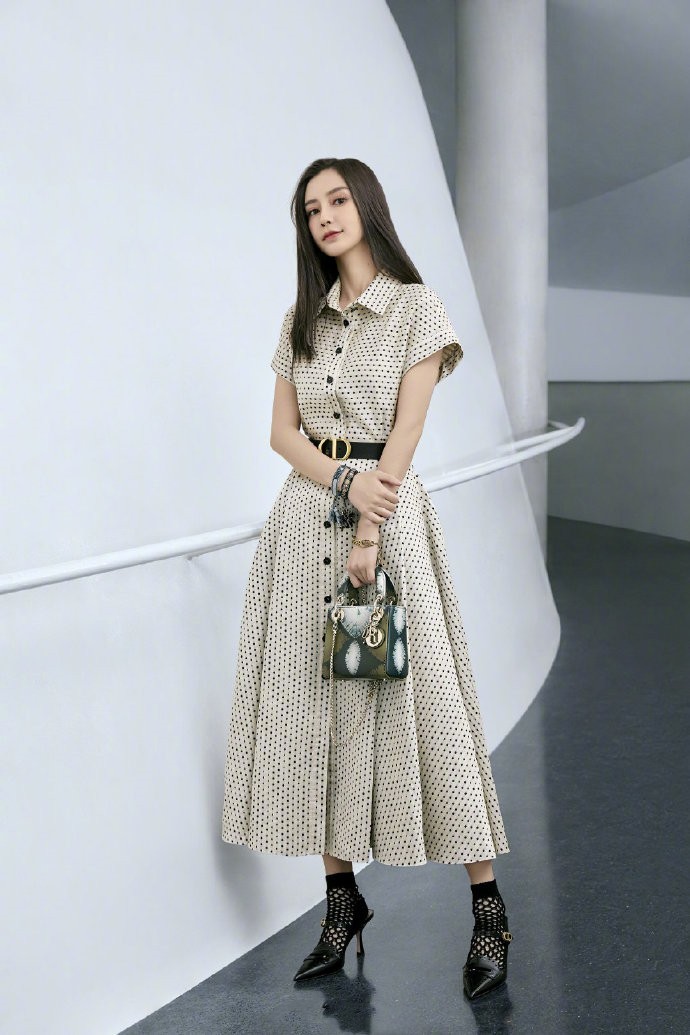 波点图案的大小也是能够影响连衣裙的整体风格,大波点元素浮夸摩登,小波点元素精致还淑女。对于长款的连衣裙来说还是小波点的图案比较合适,像杨颖这次就选择了一条长款的小波点连衣裙,搭配衬衫领口通勤感很足,给人一种淑女的温柔的风。