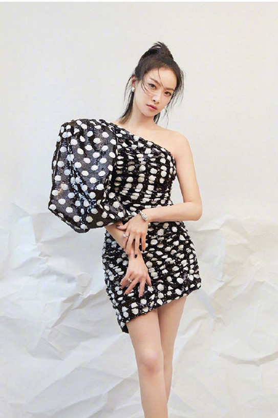 本身自带复古怀旧意味的波点元素总是给人一种神秘的摩登时尚感,从上个世纪就开始流行的波点元素深受各大设计师的喜爱。不管是黑底白点还是白底黑点都是经典的配色图案,同样可以带来独一无二的时尚感。像宋茜这次选择了一条黑底白点的连衣裙,单肩的领口还可以秀出精致的锁骨,很是性感。