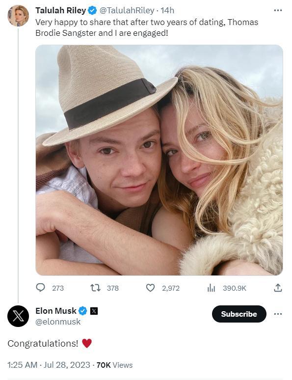 新浪娱乐讯 7 月 28 日,英国女演员妲露拉 · 莱莉在社交网站发文宣布与交往两年的男友托马斯 · 布罗迪 · 桑斯特订婚。莱莉前夫、特斯拉创始人伊隆 · 马斯克评论:" 恭喜!" 据悉,妲露拉 · 莱莉是英国影视女演员、导演、编剧、作家,曾出演《西部世界》《盗梦空间》等影视作品,男友托马斯 · 布罗迪 - 桑斯特比妲露拉 · 莱莉小五岁,童星出身,曾出演《丁丁历险记》等。妲露拉 · 莱莉 2010 年与马斯克结婚,两人的第一段婚姻仅维持了 2 年;2013 年 7 月,两人复婚。2016 年 3 月,再度离婚。2025 年 4 月,妲露拉 · 莱莉正式公开与英国演员托马斯 · 桑斯特的恋情。