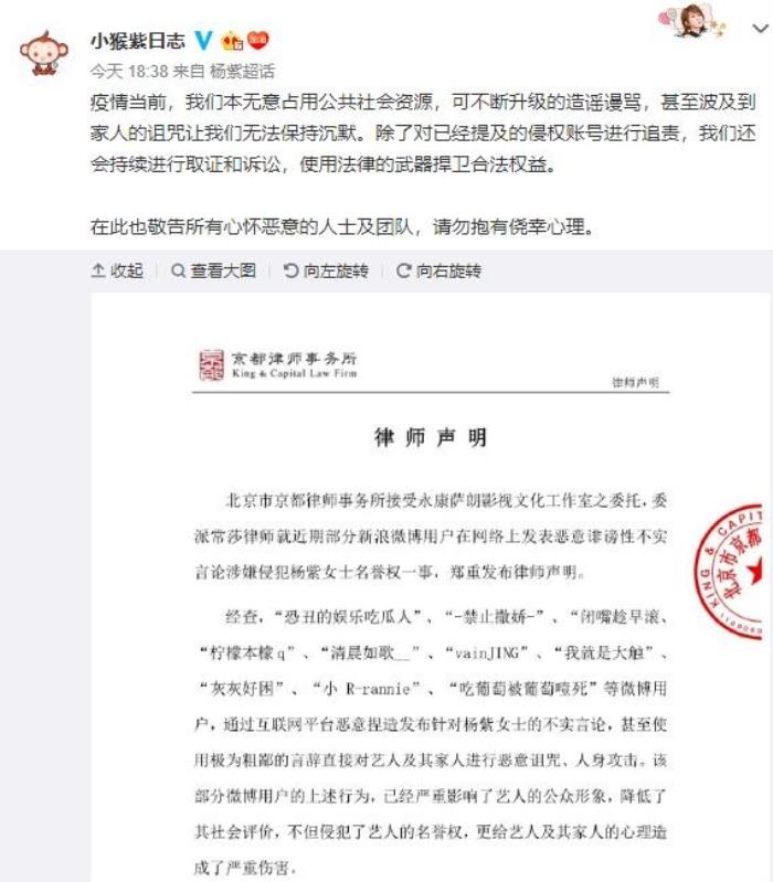 在律师声明的最后,杨紫方面要求相关微博用户删掉侵权内容,并消除不良影响,相关平台也要加强监督,后续还将进行取证和诉讼,使用法律的武器捍卫合法权益。